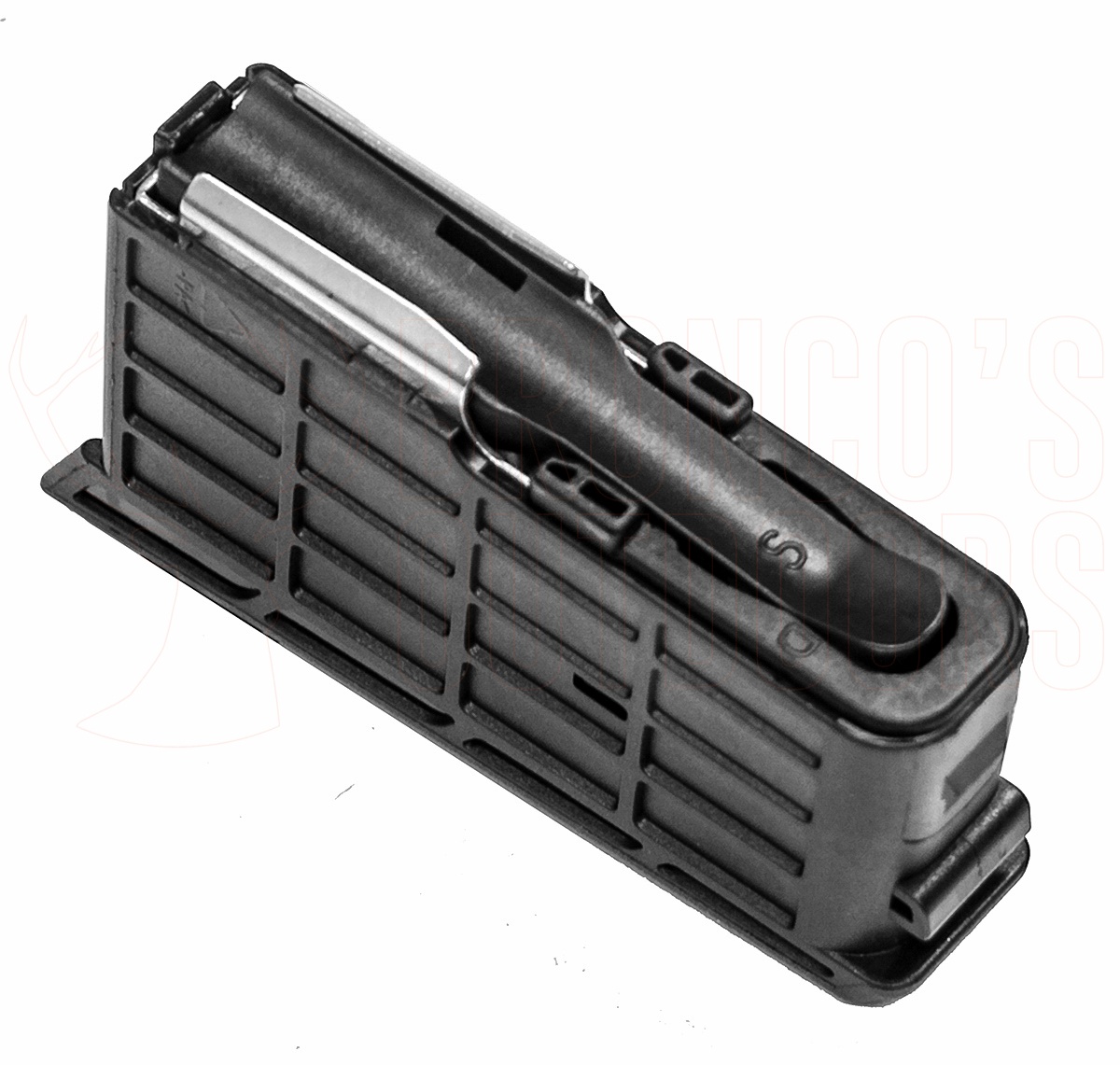 The co-polymer magazine is also loadable from the top, when inserted in the rifle. Material is 50% nylon, 50% fiberglass, with stainless magazine spring. Inserted steel collar allows insertion of cartridges from above. Magazine is held in place by Total Control Latch, to prevent unintentional loosening.