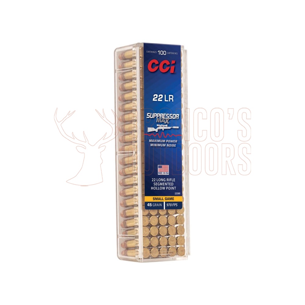 Whisper-quiet yet powerful rimfire performance is now within reach. CCI® Suppressor Max™ is specifically designed for optimal accuracy, terminal performance and noise reduction when fired through rimfire suppressors. The specialized hollow-point bullet ensures effective segmentation on impact—even at its low-decibel, sub-sonic 970 fps muzzle velocity.